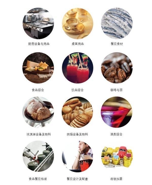 12大行业版块: 厨房设备与用品、桌面用品、餐饮食材、食品综合、饮品综合、 咖啡与茶、冰淇淋设备及物料、烘焙设备及物料、酒类综合、食品餐饮包装、餐饮设计及配套、连锁加盟及餐饮投资